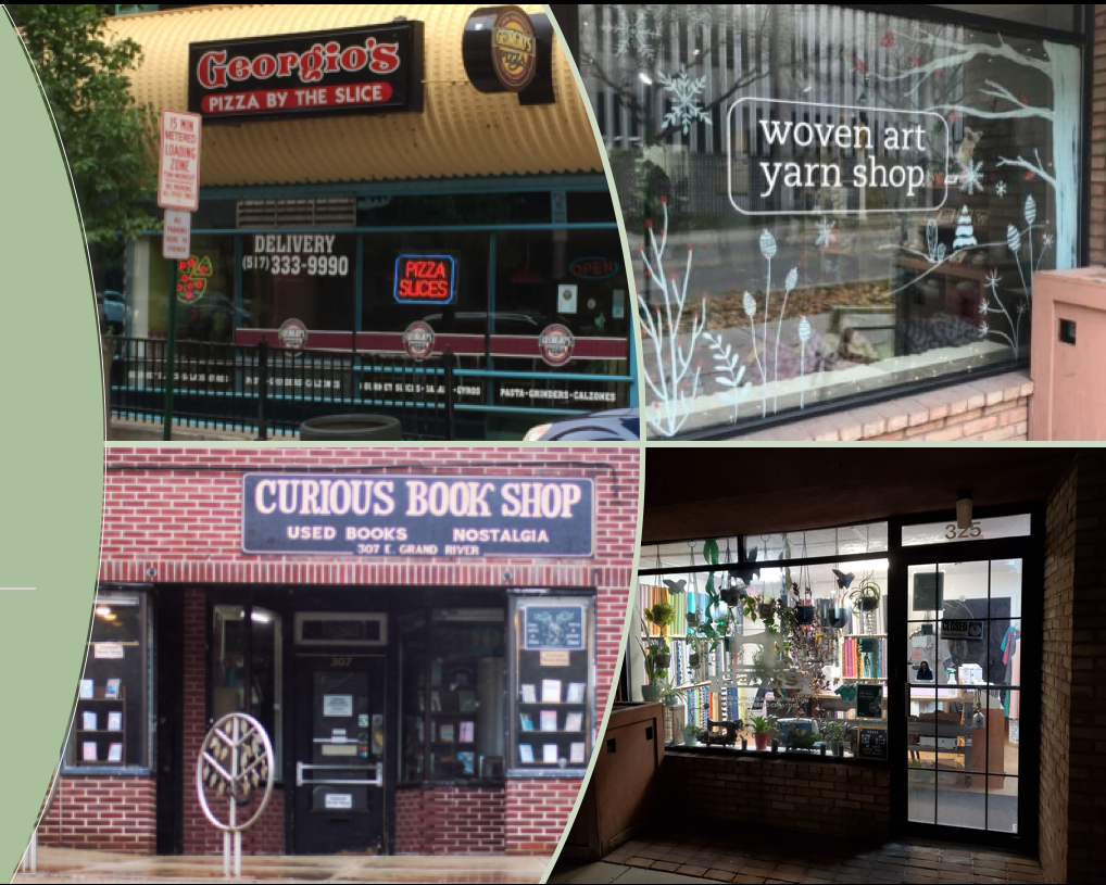 The Arts Commission discussed how to support local businesses. Featured above, clockwise from top left: Georgios Pizza, Woven Art, Seams, and Curious Book Shop.