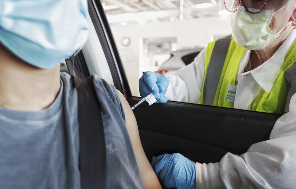 Birendra Khatiwada receives the first of two doses of the Pfizer Covid-19 vaccine at Sparrow Laboratories Drive-Thru Services (Formerly Sears Auto Center) on March 24, 2021.