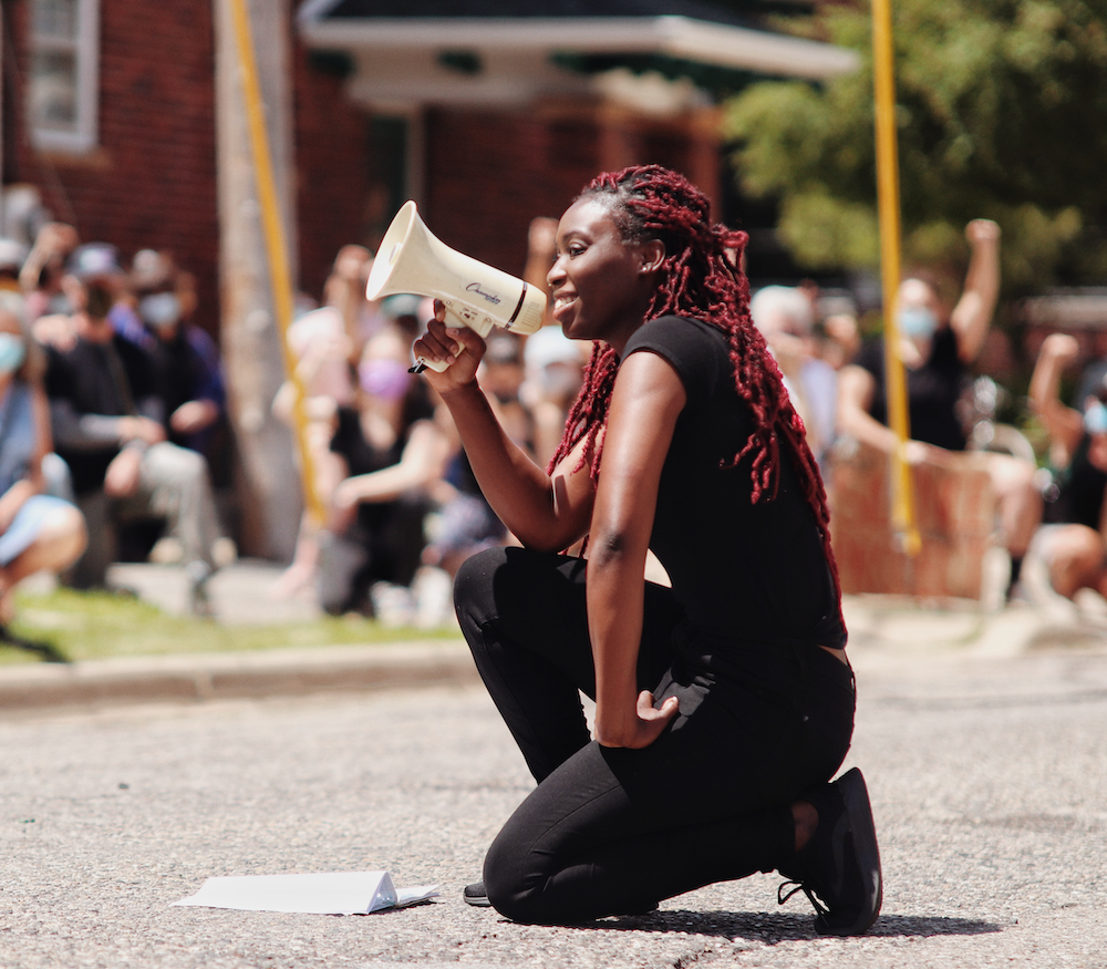 Rane asked protestors to join her in taking a knee to remember Black people killed by police.