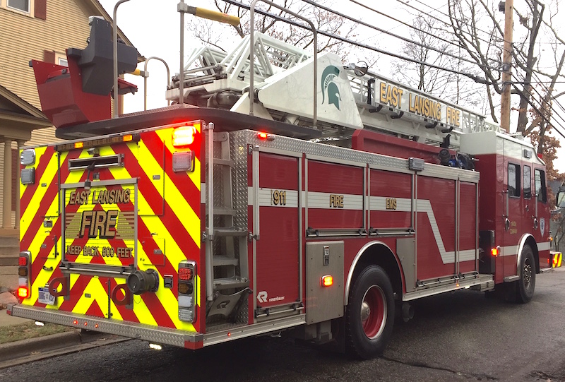 East Lansing Fire Department truck responding to a fire alarm at a house in January 2019.